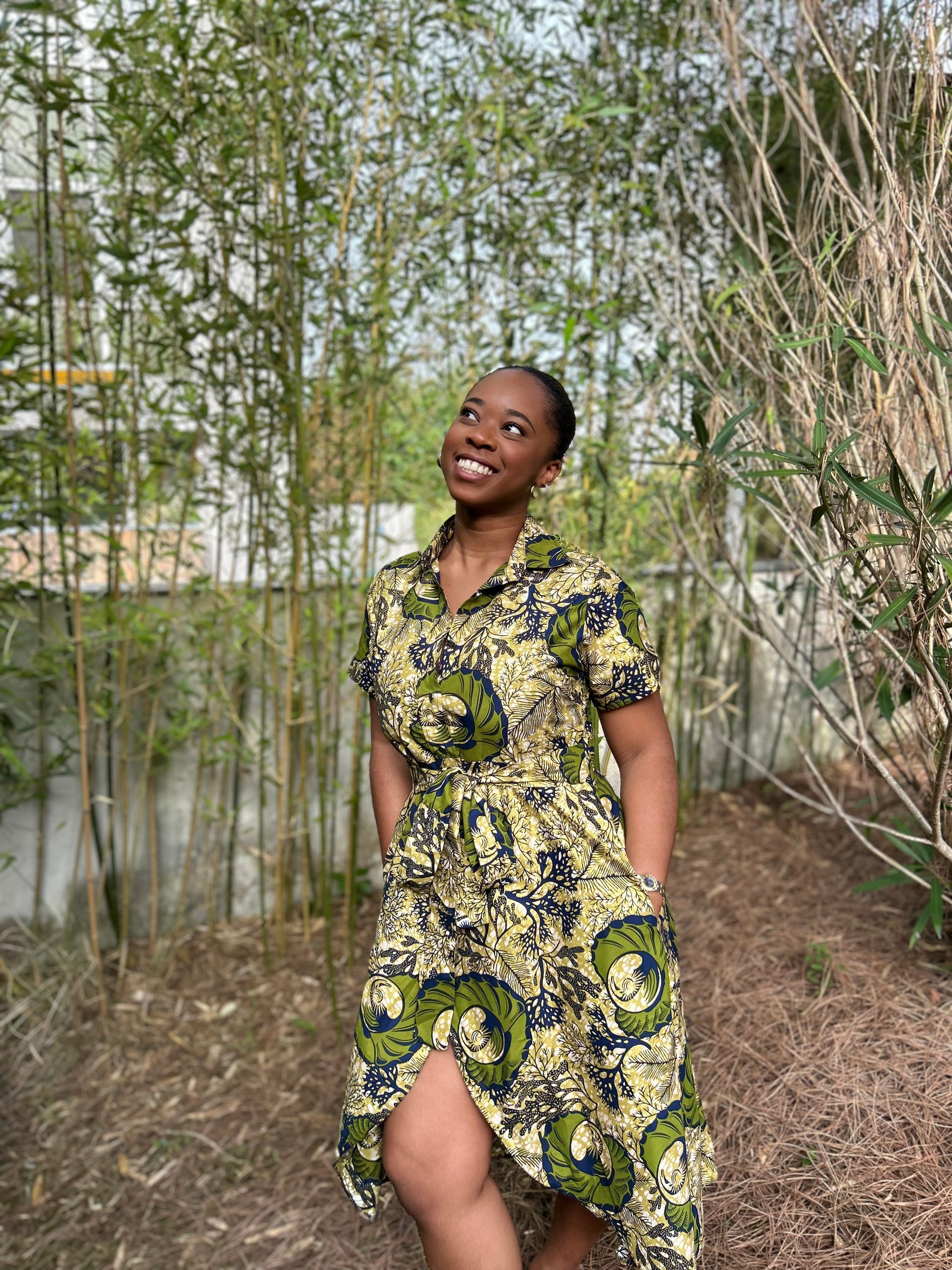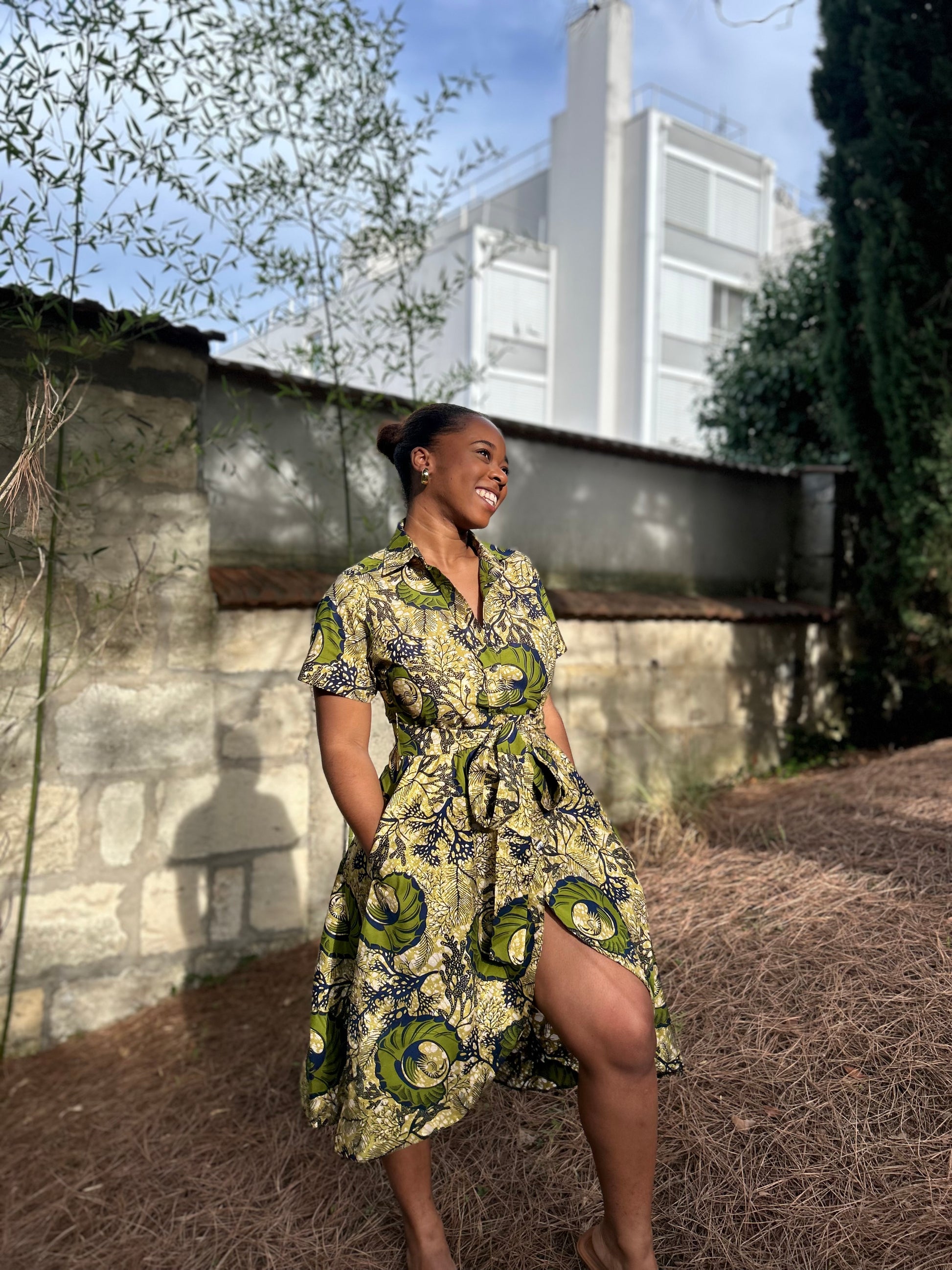Découvrez “Harmonie d’Èwe”, une robe chemisier issue de la collection Sagesse d’Afrique, célébrant la rencontre entre élégance naturelle et authenticité artisanale.